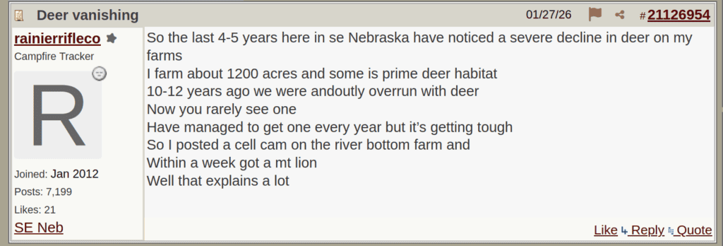 One other thing: You hear about habitat loss. Yeah, but a lot of that can be natural habitat maturation. What used to be prime deer habitat eventually matures into stuff that’s less attractive to deer. Somebody came in and logged a bunch of cedars about a decade before we got the property. When we moved in that was prime bedding habitat. Now that the stuff has grown, we see far fewer deer utilizing it. In some places, the canopy has grown over places that used to be filled with woody browse. Now, it’s become a shady deer desert. This next year, I’m planning quite a bit of re-arranging. I’ve got cedar thickets that have outlived their usefulness. Those are going to be bulldozed at the earliest opportunity.